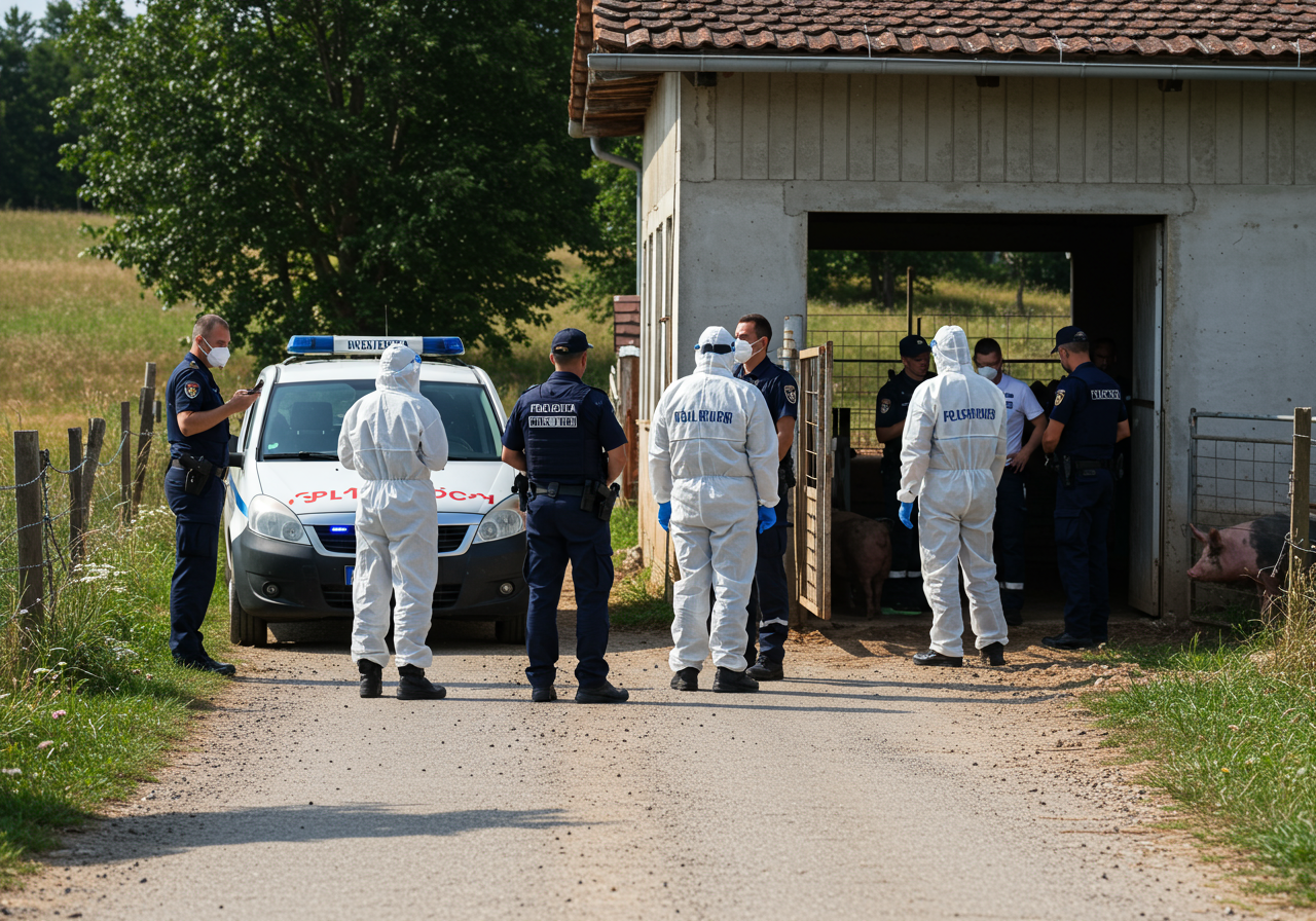 Croatian veterinary service personnel and local civil protection members, dressed in protective suits and uniforms, are standing at the entrance of a pig farm in Jagodnjak municipality, Osječko-baranjska County, eastern Croatia. They are observing the implementation of newly established restrictive zone measures following African Swine Fever outbreaks. A marked official vehicle, likely a white van or SUV, with subtle Croatian government insignia, is parked on the unpaved road adjacent to the farm. The scene is illuminated by bright natural daylight, characteristic of a mid-July afternoon in a rural Croatian landscape.