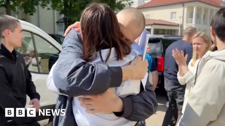 Footage on social media shared by Tikhanovskaya’s representatives show the couple smiling and hugging and Tikhanovsky appears to have lost a lot of weight in custody.