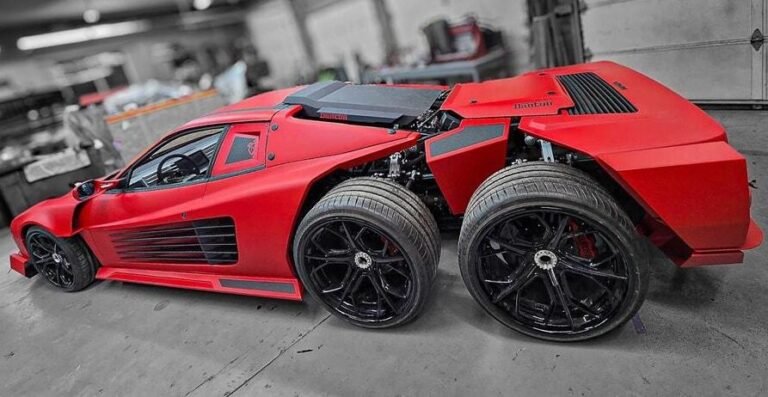 Ein Tuner, der sich mehr für postapokalyptische Optik als für die typische Ferrari-Tradition interessiert? Man erhält einen Sechsrad-Testarossa, der aussieht, als käme er direkt aus „Mad Max: Fury Road“.