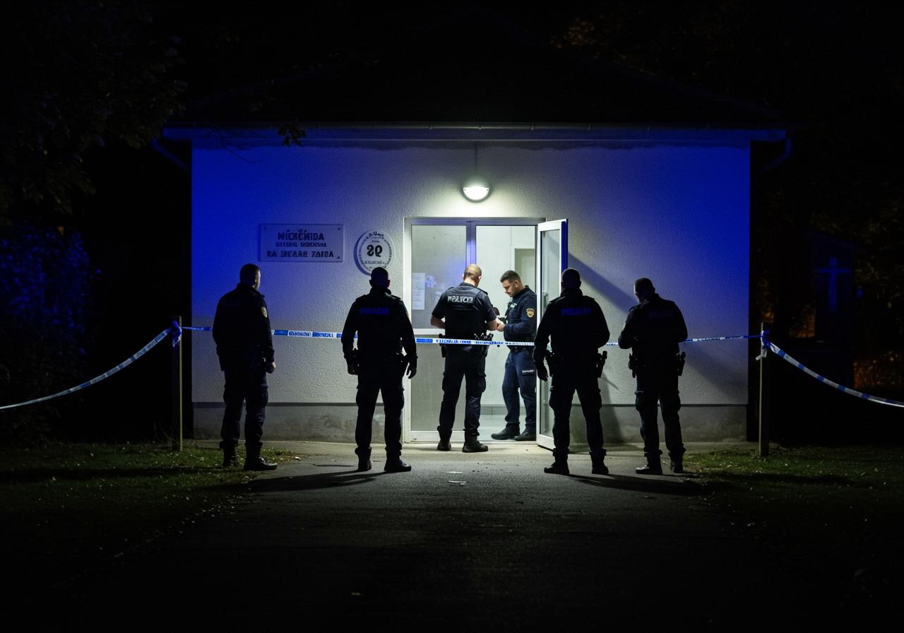 Croatian police officers from the Osječko-baranjska Police Department are actively investigating the entrance of a dimly lit morgue building at a cemetery in Đakovo, Croatia, during the early morning hours. Yellow crime scene tape is visible around the perimeter of the building's entrance. Flashlight beams from the officers cut through the darkness, highlighting details on the ground and the building's facade. The atmosphere is somber and focused as the investigation into the recent burglary unfolds.