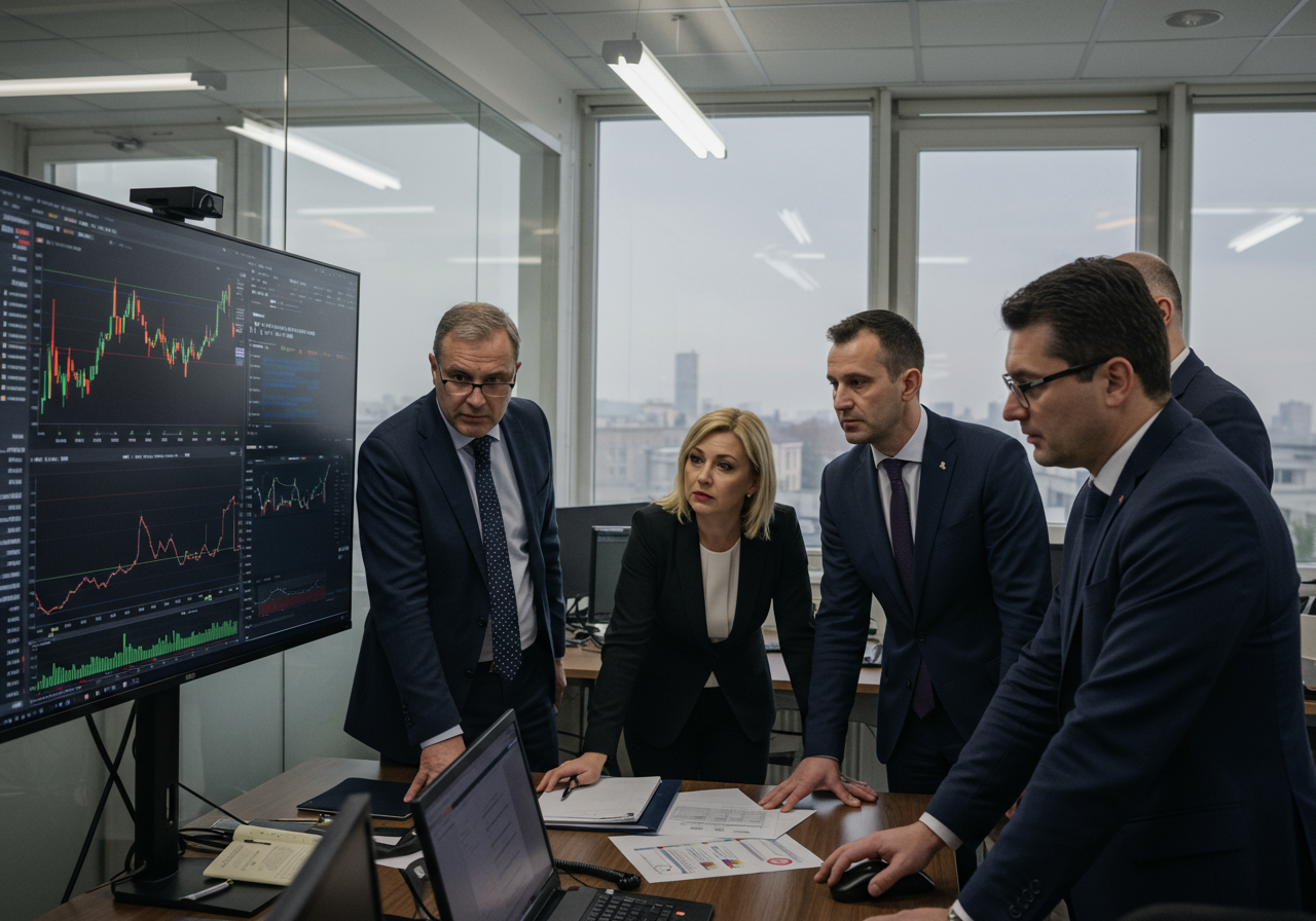 A small group of financial professionals, dressed in sharp business attire, intently observe a large monitor displaying abstract financial data charts within a modern, well-lit financial office in Zagreb, Croatia. Their expressions convey focused analysis and immediate reaction to news, possibly discussing the significant 5.26% rise in Zagreb Stock Exchange (ZSE) share prices on a bright Friday morning. Natural light streams through large windows, illuminating a contemporary Croatian office interior, emphasizing a serious and responsive financial environment.