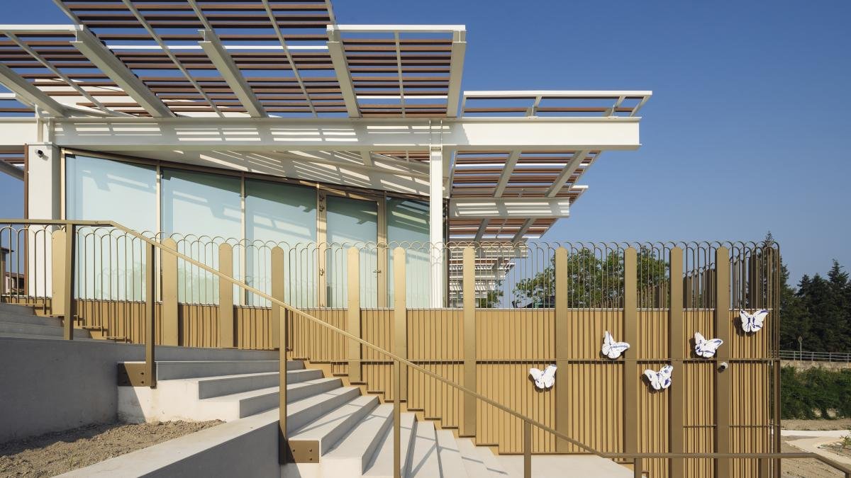 La Fondazione Caterina Dallara ha una nuova sede. È una struttura leggera, che rimpiazza un vecchio fienile non utilizzato a pochi passi dalla sede della Dallara Automobili. “Volevamo che la nostra Fondazione trovasse sede in un edificio oggettivamente bello” spiega Giampaolo Dallara, presidente e fondatore. La sfida progettuale è stata affidata ad Alfonso Femia (Atelier Alfonso Femia), che nel 2018 aveva realizzato la Dallara Academy, lo spazio didattico e museale dell’azienda di Varano de’ Melegari dove sono esposte le auto progettate da Giampaolo Dallara dalla Miura alla X1/9, i prototipi e le monoposto Indycar, Formula 3 e Formula 2. Il risultato è un edificio moderno, secondo Dallara, uno spazio “attrattivo, per stimolare il desiderio di ritrovarsi insieme ed evocativo dei sentimenti che ci hanno guidati nell’istituzione della fondazione”. A cominciare dal simbolo della fondazione: le farfalle, realizzate dal maestro ceramista Danilo Trogu in ceramica bianca e blu, che avvolgono le parti esterne dell’edificio che si affaccia sul Parco dei Melograni, inaugurato nel 2022, con i suoi campi sportivi (volley, basket e pump-track) e gli orti sociali.