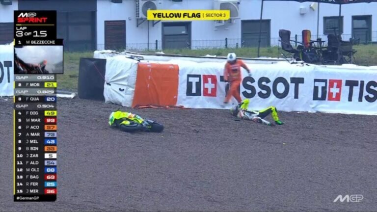 Ore di ansia per Franco Morbidelli, caduto all’inizio della Sprint MotoGP al Sachsenring, in Germania. Il romano della VR46 Ducati ha perso il controllo della moto sulla pista fradicia di pioggia, finendo lungo alla curva 8 durante il terzo giro della minigara poi vinta da Marc Marquez su Marco Bezzecchi e Fabio Quartararo.