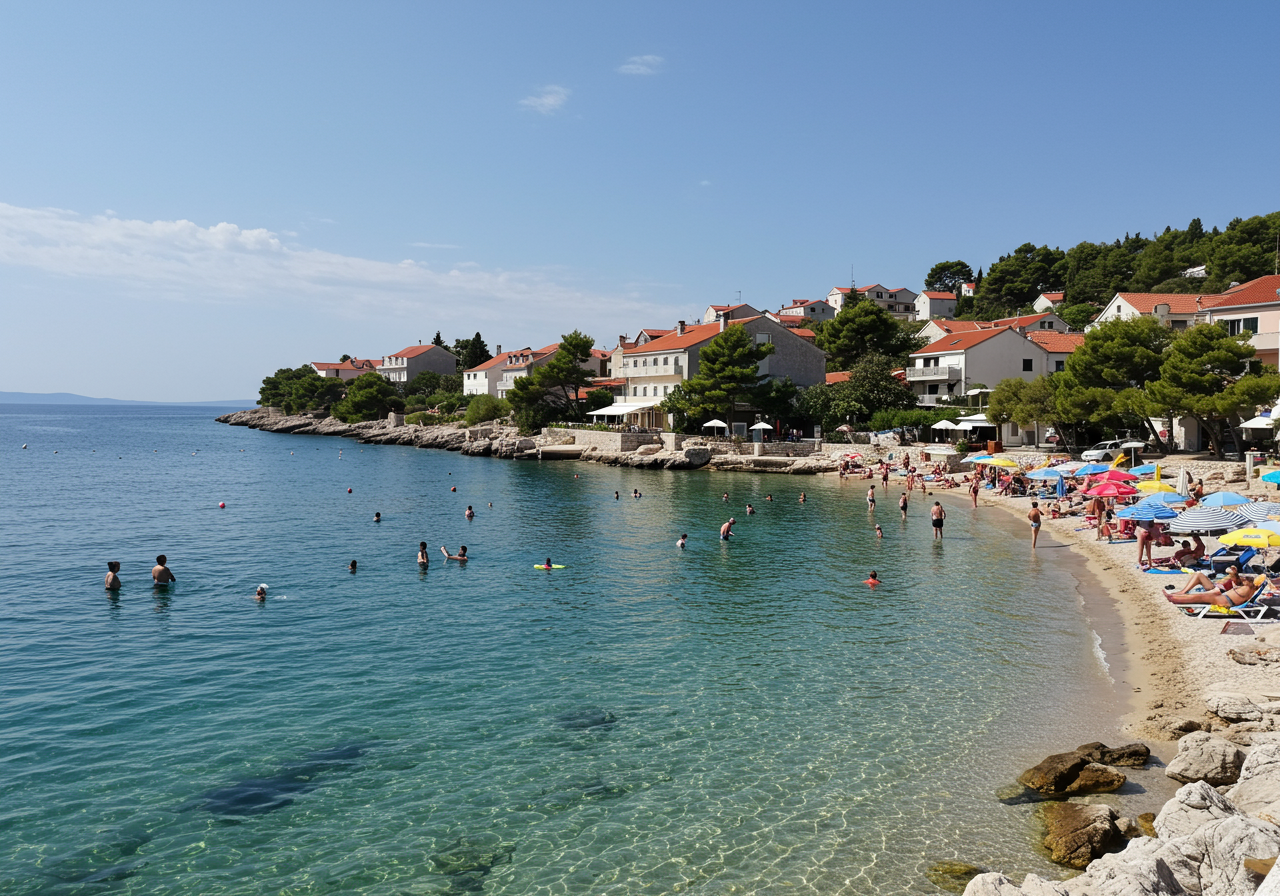 Daytime wide shot of a scenic beach in Croatia during July. Tourists are visible enjoying the clear blue Adriatic Sea and the warm summer weather, some on sun loungers under umbrellas, others wading or swimming. The atmosphere is pleasant and relaxed, not densely crowded, reflecting a slightly softer peak season. In the background, modern resort hotel buildings are visible among traditional Croatian coastal architecture, suggesting popular tourist areas in Istra or the Split-Dalmatia County. The sunlight is bright and natural, casting soft shadows, capturing the typical mid-summer look of the Croatian coast.