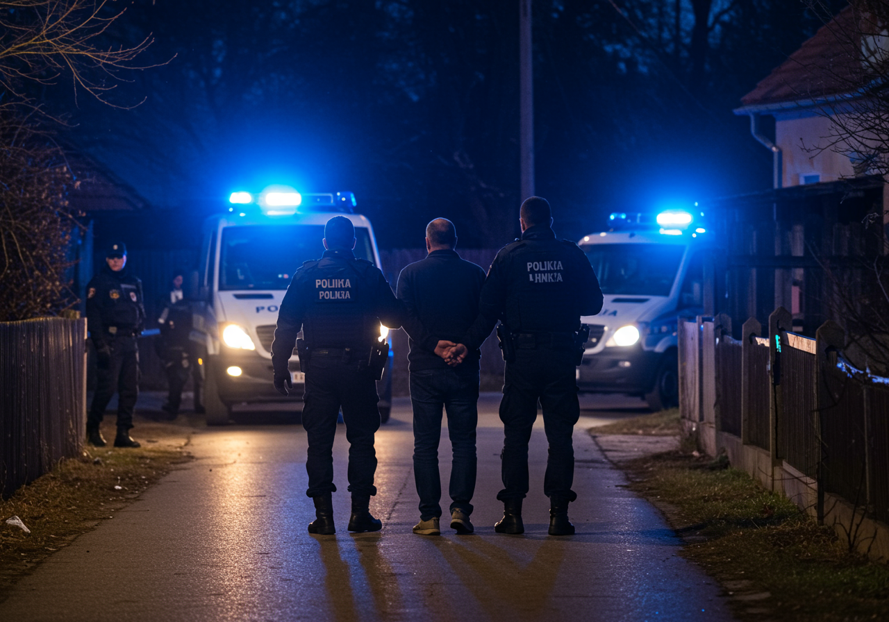 Croatian Anti-Terrorist Unit Lučko (ATJ Lučko) officers in dark tactical gear arresting 44-year-old Mirko H. in the pre-dawn hours on a quiet residential street in Berek, Croatia. Mirko H. stands calmly, hands behind his back, as officers secure him. Police vehicles with flashing blue lights are visible in the background, casting a cool, muted light on the surrounding rural Croatian homes and fences, reflecting the aftermath of an intensive search operation.