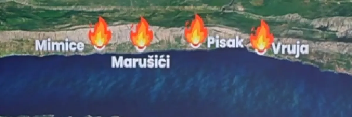 Ovo je područje na kojem se vatrogasci, policija i vojska bore s požarom – izbio je u mjestu Pisak, druga fronta mjesto Mimice, pa Marušići, uvala Vruje bila je još jedno mjesto na kojem se vatra rasplamsala.