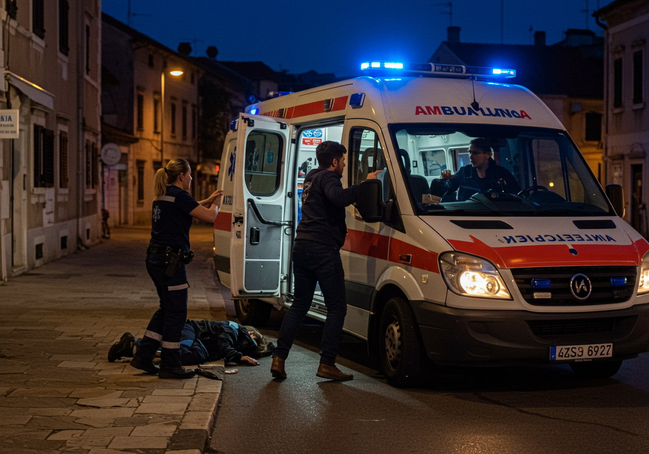 A dramatic scene unfolds on Stjepana Radića street in Šibenik, Croatia, on a Tuesday evening. A 23-year-old male, appearing agitated and under the influence of drugs, is physically assaulting a 29-year-old female ambulance driver near the open driver's door of a white Croatian ambulance vehicle. The driver, in her uniform, is trying to defend herself or escape. A 32-year-old female paramedic, also in uniform, is nearby, showing distress and possibly injured, having attempted to intervene. The ambulance's emergency lights are flashing, casting a chaotic glow on the urban street. Dim streetlights illuminate the background of typical Šibenik buildings under a late evening sky.
