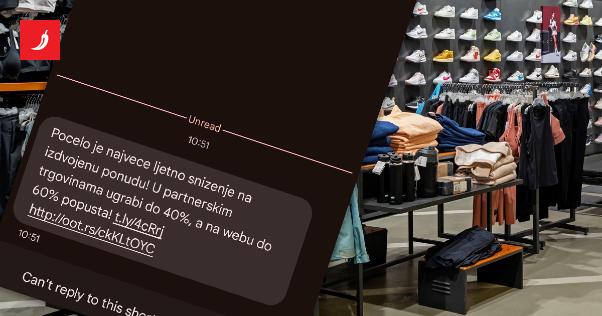 “Pocelo je najvece ljetno snizenje na izdvojenu ponudu! U partnerskim trgovinama ugrabi do 40%, a na webu do 60% popusta”, stoji u sadržaju SMS poruke, nakog kojeg su potencijalnoj žrtvi ponuđene dvije poveznice.