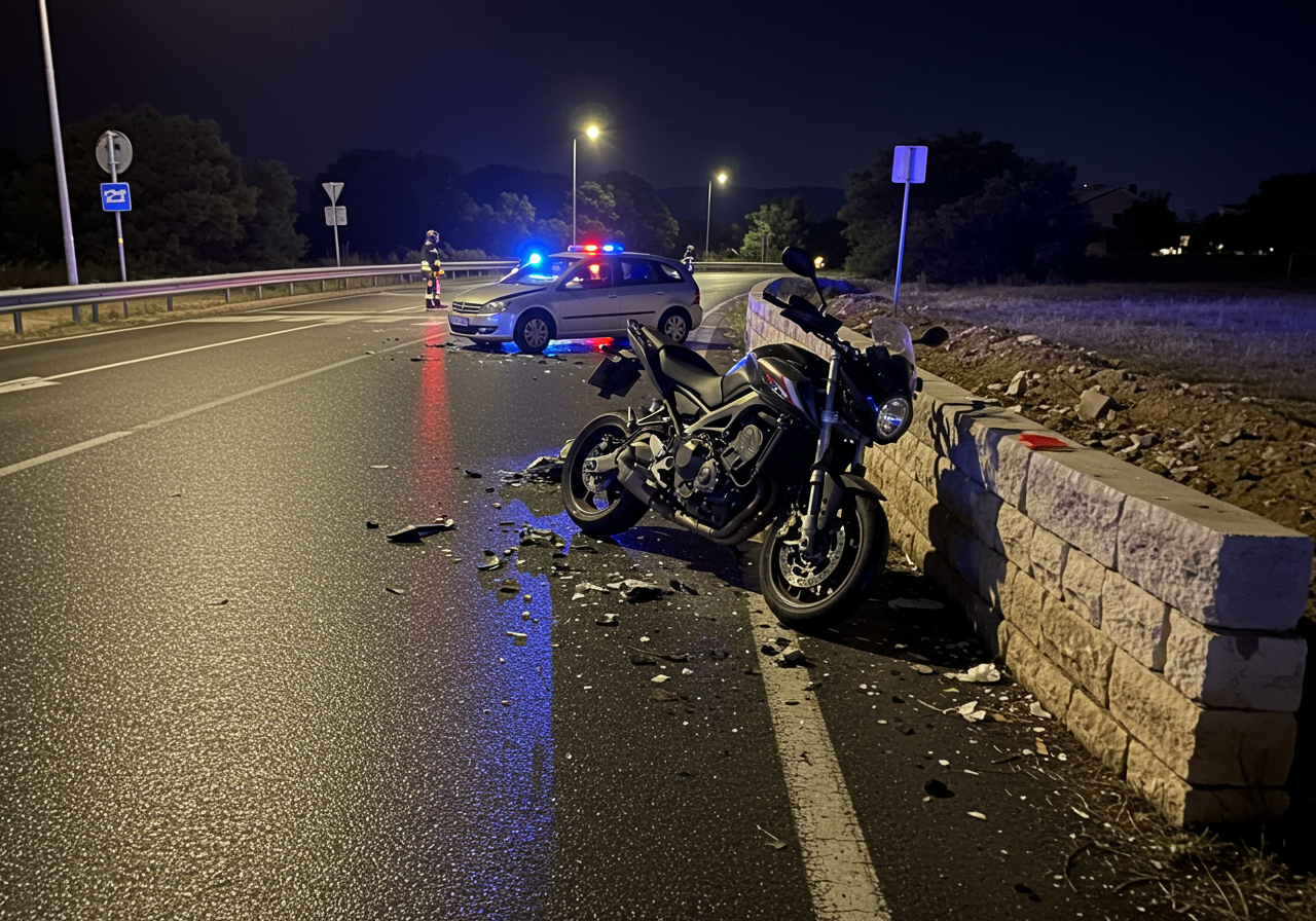 Early morning, 00:25, August 17th, at an intersection in Vodice, Croatia. The immediate aftermath of a serious traffic accident. A severely damaged motorcycle is propped against a protective concrete and stone wall. On the asphalt road nearby, a passenger car shows significant front-end collision damage. Debris is scattered across the dark pavement. Beyond the wall, a distinct patch of earthen terrain is visible, indicating impact. The scene is dimly illuminated by the ambient streetlights, with distant emergency vehicle lights casting subtle blue and red reflections on the wet road surface. An editorial wide shot capturing the quiet and severity of the crash site.