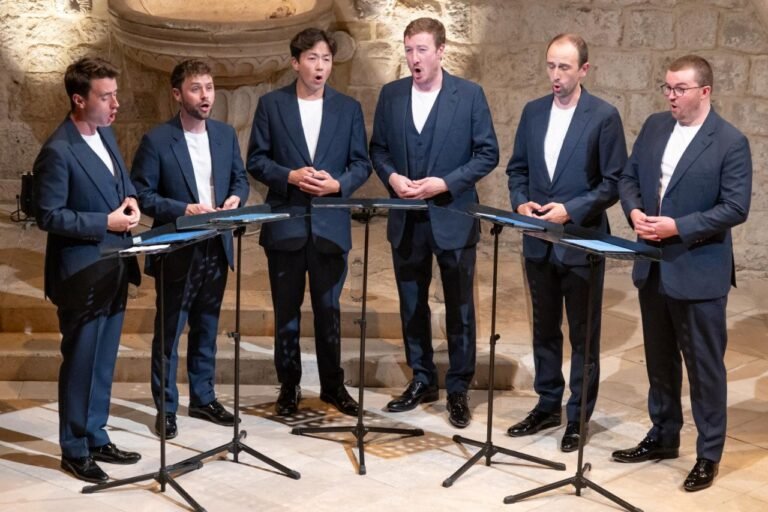 Svojim prepoznatljivim zvukom, preciznom izvedbom i šarmantnim scenskim nastupom, šesteročlani ansambl – kontratenori Patrick Dunachie i Edward Button, tenor Julian Gregory, baritoni Christopher Bruerton i Nick Ashby te bas Piers Connor Kennedy – duboko su dojmili festivalsku publiku. Izveli su program naslovljen Anđeli i demoni, osmišljen kao glazbeno putovanje kroz više od 500 godina zborske literature, nadahnuto simbolikom svjetla i tame u kršćanskoj tradiciji.