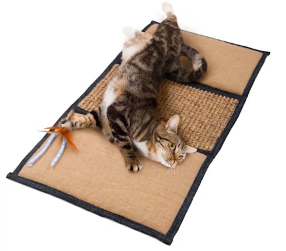 The Petlinks Scratch & Play Cat Mat, available now at Petco, is made from tightly woven denim with a sisal-style center panel and attached toy. It’s large enough for stretching and lounging, yet compact enough to move around your home or tuck into a corner. Reviewers note it holds up exceptionally well to daily clawing, making it a go-to for multi-cat households.