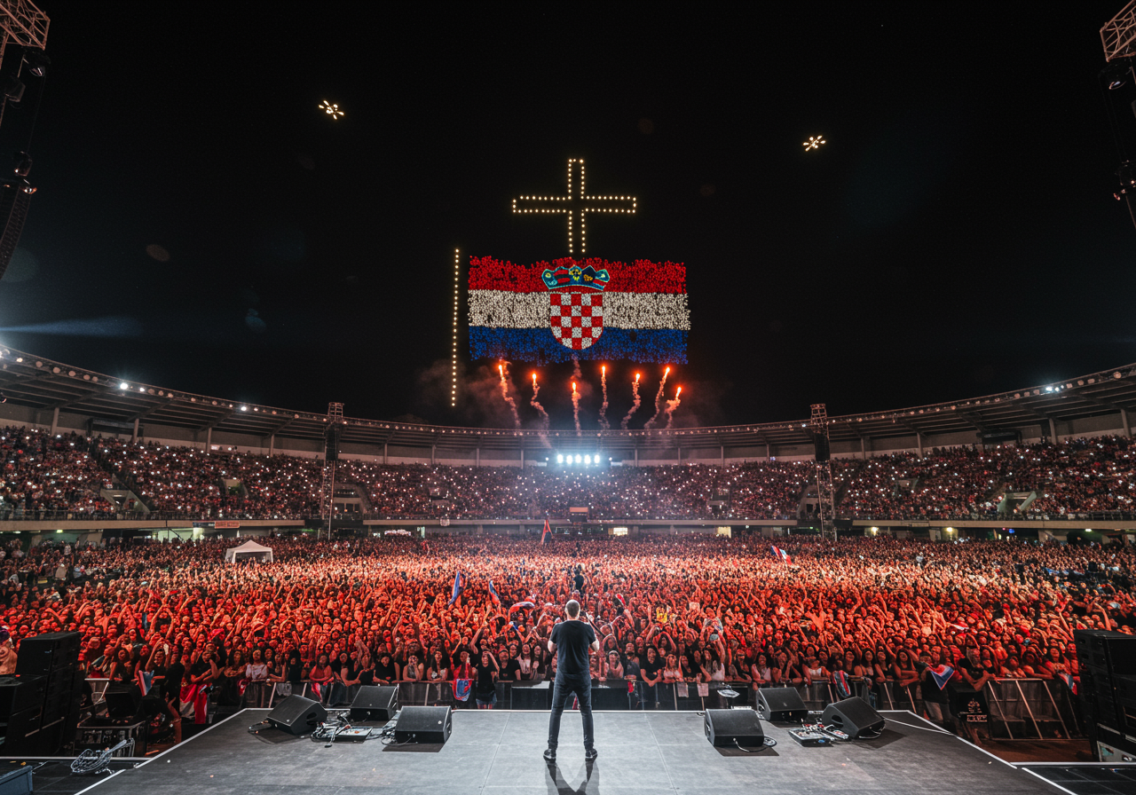 Atmosfera na sinjskom hipodromu bila je prožeta snažnim emocijama i osjećajem nacionalnog zajedništva. Thompson je pred oduševljenom publikom izveo niz svojih najpoznatijih domoljubnih himni, uključujući „Anicu – Kninsku kraljicu“, „Pukni puško“ i „Bojnu Čavoglave“, koje je ujedinjena masa zborno pjevala. Vizualni i scenski efekti bili su izuzetno impresivni: od upečatljivih vizualnih rješenja i pirotehničkog spektakla, pa sve do jedinstvenog showa dronova koji su na noćnom nebu iscrtavali simbole poput Blažene Djevice Marije, križa i hrvatske zastave, dodatno pojačavajući osjećaj ponosa. Sam Marko Perković Thompson obratio se publici naglašavajući važnost poštovanja hrvatskih branitelja i njihovih simbola, poručivši pritom: „Jugoslavije nema, hrvatski čovjek živi i uvijek je spreman za svoj dom“.