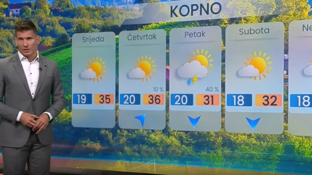 U ponedjeljak je krenuo toplinski val, a najneugodnija vrućina bit će sredinom tjedna. Topliji zrak stiže u polju vedrine oko Sredozemlja, tj. anticiklone koja ipak polako slabi. Naime, poremećaji se premještaju vrlo blizu našim krajevima, ali i dalje glavninom sjevernije od nas. Malo će nas okrznuti, čini se, s četvrtka na petak