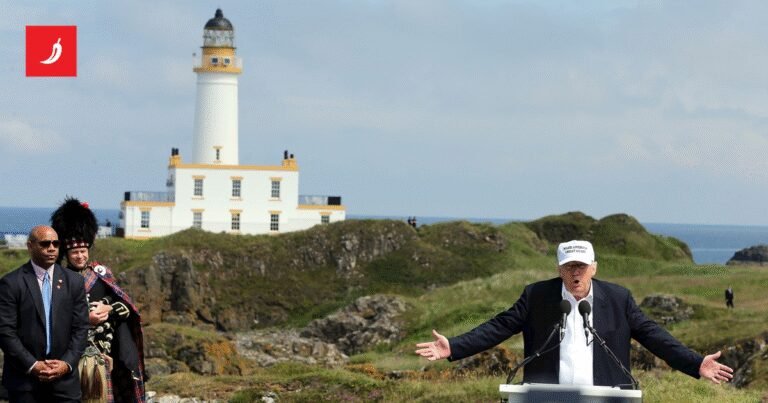Trump je posjetio oba golfska terena tijekom svoga prvog mandata 2016. godine, iskoristivši priliku da pohvali brexit. Dok je obilazio Turnberry, pratili su ga gajdaši u kiltovima.