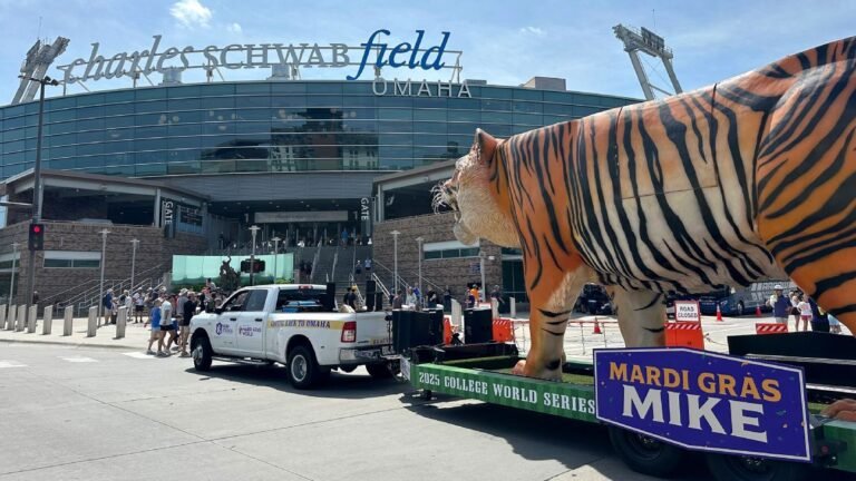 Fitz Kern hoped that his Tigers would survive until this weekend so he could join in on the fun in Omaha. He stayed behind so he could help celebrate his daughter’s third birthday. LSU did its part on Tuesday, beating UCLA 9-5 in a winner’s bracket game. As LSU fans celebrated near the east side of the stadium, Stone stopped the float in the street. For a moment, it was a scene from home — fans dancing and snapping photos with the snarling tiger. Then a police officer working traffic gave him a stern warning to move along.