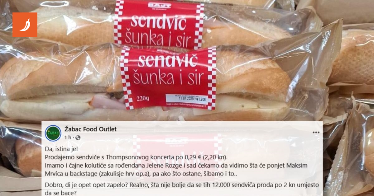 “Da, istina je! Prodajemo sendviče s Thompsonovog koncerta po 0.29 € (2.20 kn). Imamo i čajne kolutiće sa rođendana Jelene Rozge i sad čekamo da vidimo što će ponijeti Maksim Mrvica u backstage (zakulisje hrv. op. a), pa ako što ostane, šibamo i to… Dobro, di je opet opet zapelo? Realno, što nije bolje da se tih 12.000 sendviča proda po 2 kn umjesto da se bace?”, napisali su u objavi.